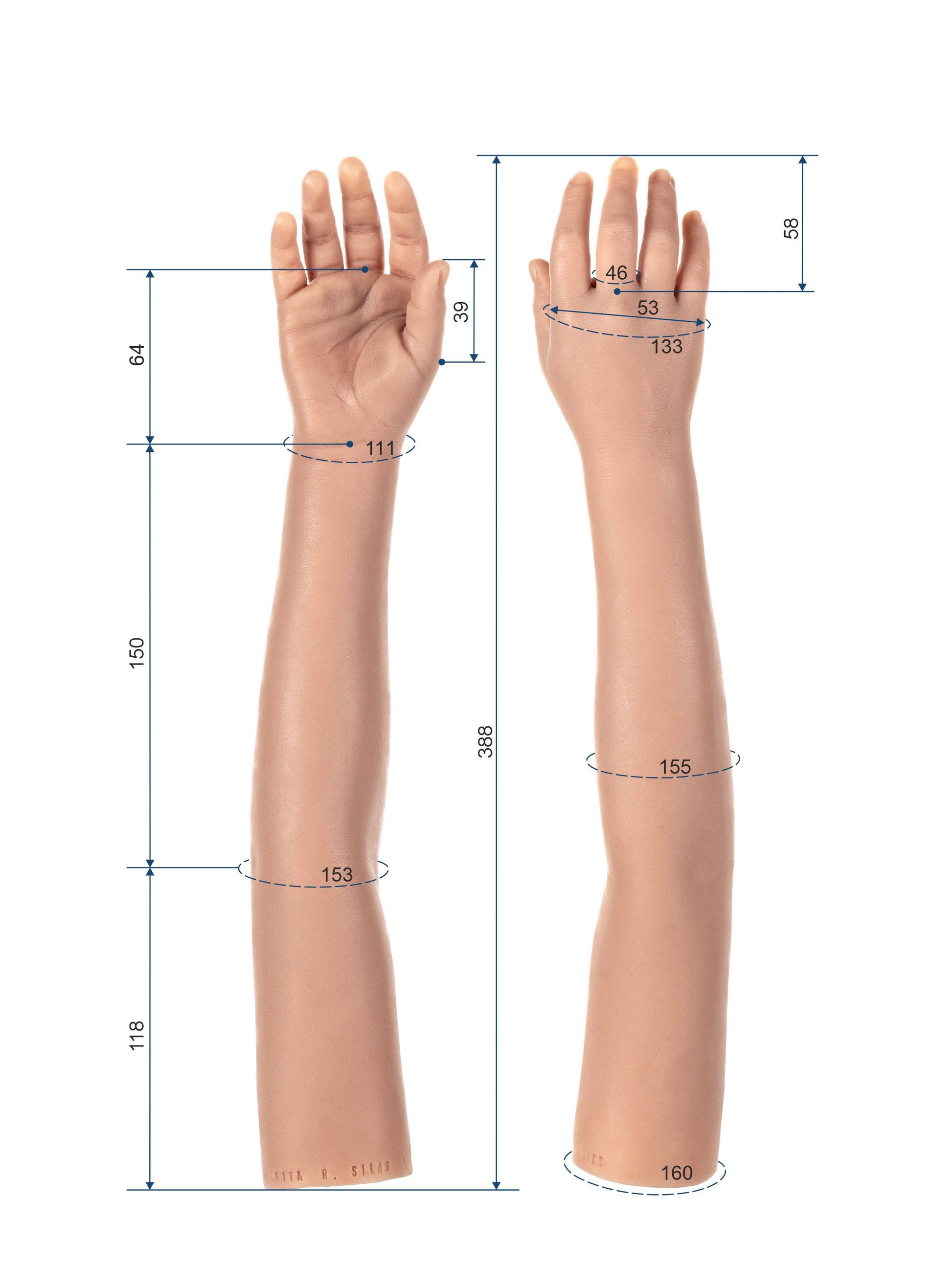 This product is a silicone cosmetic glove designed to cover and improve the external appearance of upper-limb prostheses for arm-level amputations. The glove is intended to be used as a aesthetic cover, compatible with internal fixation systems provided by certified prosthetists.