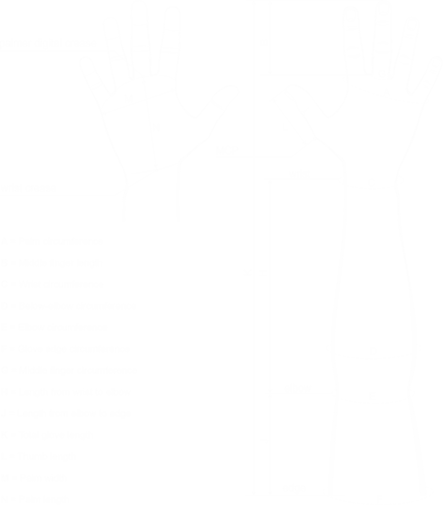 When measuring your patient for the best match, it is important to take the two primary measurements of ‘A’ Palm Circumference and ‘B’ Middle Finger Length to determine the closest match before assessing other measures for fit.