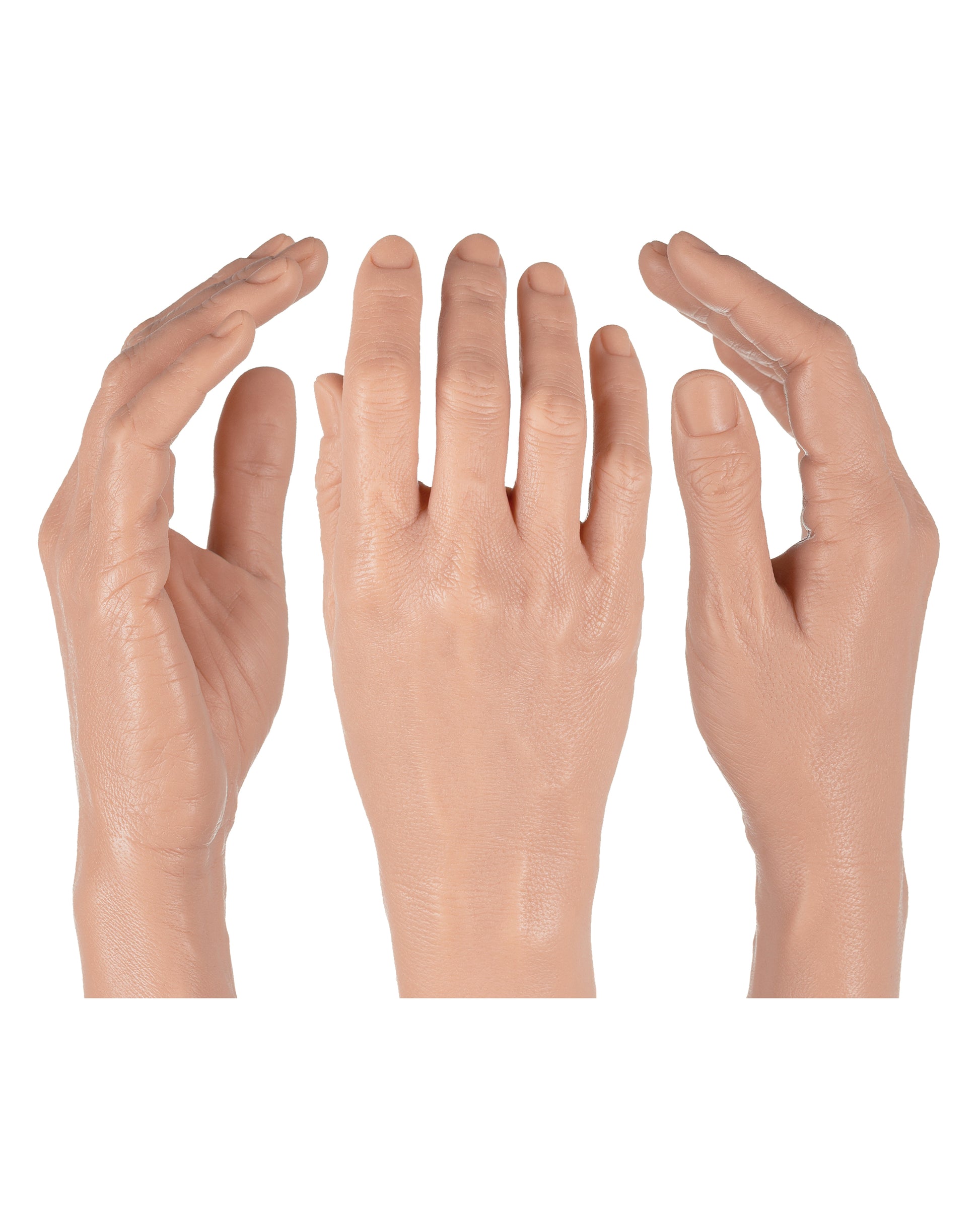 This product is a silicone cosmetic glove designed to cover and improve the external appearance of upper-limb prostheses for arm-level amputations. The glove is intended to be used as a aesthetic cover, compatible with internal fixation systems provided by certified prosthetists.